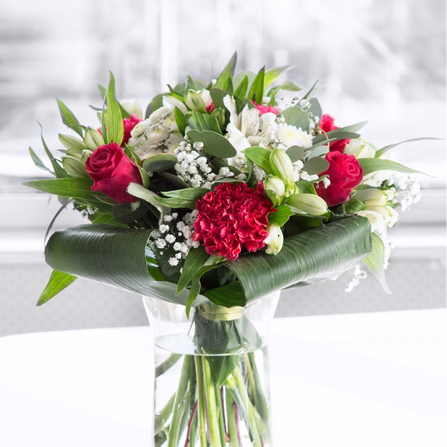 Quality you can trust – each flower is hand-selected to ensure freshness and longevity. The stunning design is complemented by white alstroemeria and rich aspidistra foliage.