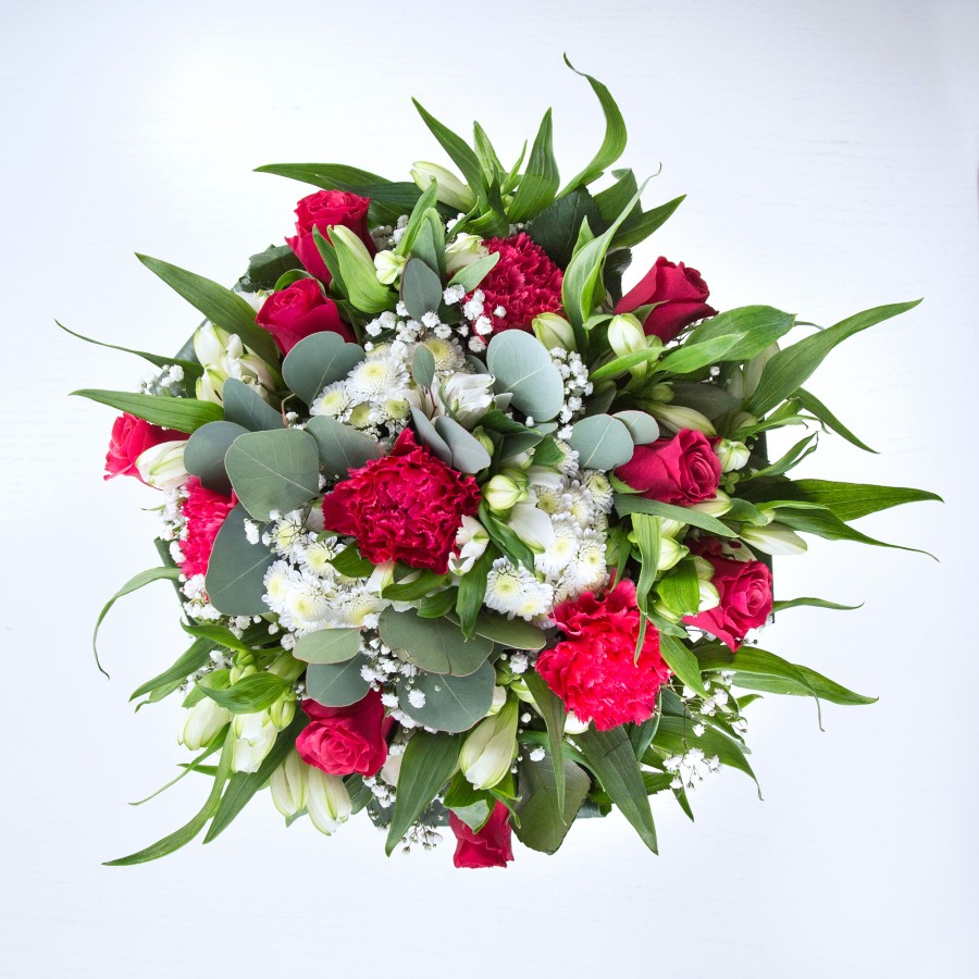 Celebrate beauty with our unique and vibrant bouquet, meticulously designed to inspire. This arrangement features bold red roses, cheerful carnations, and pure white chrysanthemums, intertwined with airy gypsophila for added elegance.